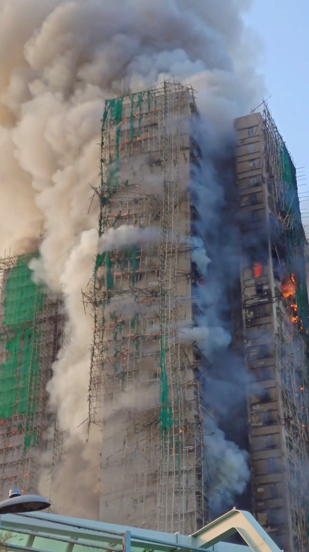 ¿Qué sabemos del incendio? El origen del incendio del miércoles no estaba claro, pero no se podía ocultar la facilidad con la que el fuego se propagó rápidamente por la malla verde e hizo que las celosías de bambú cayeran al suelo envueltas en llamas. Las llamas comenzaron en los tradicionales andamios de bambú que rodeaban los edificios de 31 plantas del complejo Wang Fuk Court, en el distrito Tai Po de la zona norte, que se encontraba en obras. El fuego aún era visible el jueves en la tarde en algunas de las ventanas, mientras los rescatistas rociaban con mangueras los exteriores carbonizados. Los incendios en cuatro de las ocho torres de apartamentos ya fueron extinguidos y los demás en otros tres edificios están “bajo control”, según las autoridades. El rascacielos restante no se vio afectado.