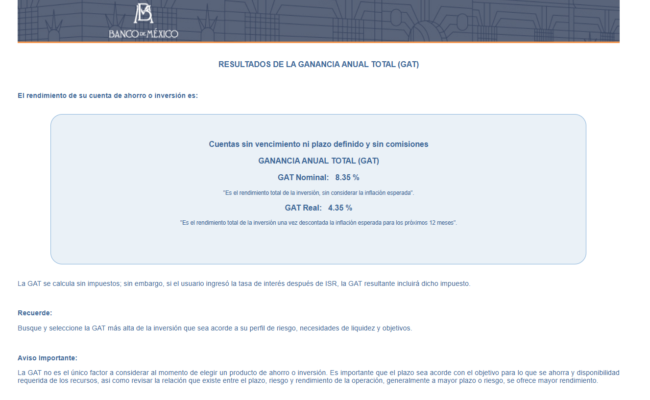 El Banco de México tiene una herramienta de cálculo de la Ganancia Anual Total (tanto nominal como real), según diferentes tipos de inversión y ahorro: – Pagaré – Certificado de depósito – Otros productos de ahorro o inversión (con o sin comisiones) Para ello, necesitas seleccionar el tipo de instrumento de inversión, la fecha de pago y la Tasa de Interés Anual (%). En ocasiones te pedirá otra clase de información. Al final, brindará un cálculo para la GAT como el siguiente: Este ejemplo fue realizado con la siguiente información hipotética: Tipo de producto: Cuentas sin vencimiento y sin comisiones Periodicidad del pago de intereses: Mensual Tasa de interés anual: 8.0500 % Fecha del cálculo: 29-01-2026 Inflación utilizada: 3.84 %