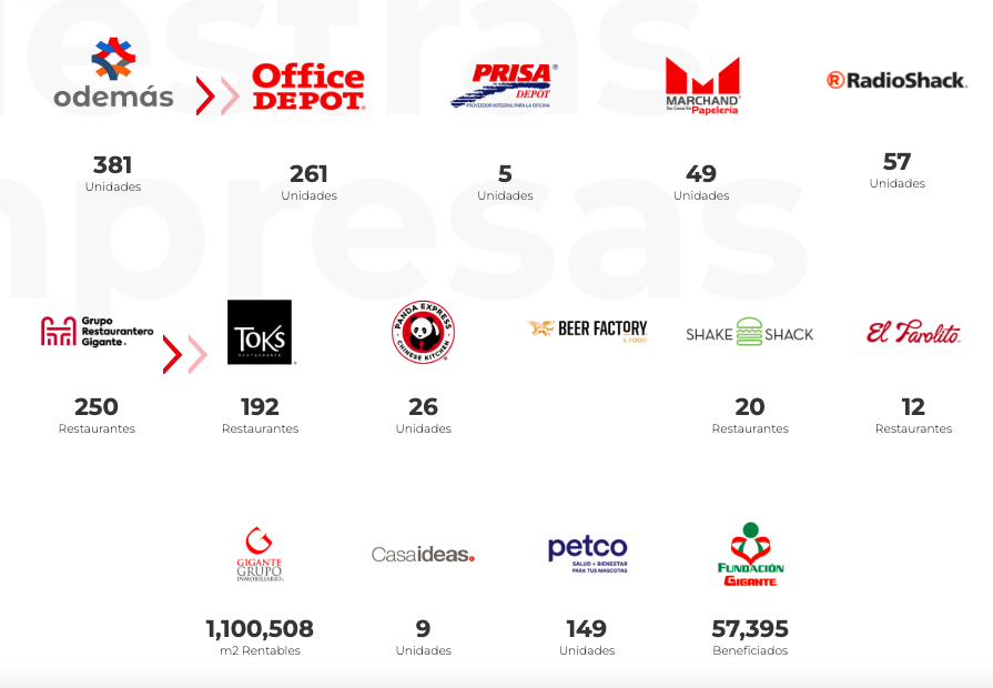 31.8 millones de clientes . Con 50 años de operaciones, Toks sigue siendo la cara de Grupo Gigante en el sector restaurantero, manteniendo su presencia nacional tras la venta de los supermercados en 2007. En la actualidad, Grupo Gigante se ha consolidado como un grupo diversificado con presencia en comercio especializado, restaurantes e inmobiliario. Según la Bolsa Mexicana de Valores y el sitio web del grupo, algunas de sus marcas más importantes en México son: -Toks -Office Depot -Prisa Depot -Marchand Papelería -RadioShack -Grupo Restaurantero Gigante -Panda Express -Beer Factory -Shake Shack -El Farolito -Grupo Gigante Inmobiliario -Casaideas -Petco -Fundación Gigante En el sector de comercio especializado, Office Depot ha sido clave desde la coinversión de 1994 y, tras distintas adquisiciones, el grupo consolidó en 2013 el control de la compañía en México y Latinoamérica. Petco llegó a México y Chile con tiendas físicas y en línea, mientras que Casaideas se incorporó en 2022 mediante un “joint venture” para desarrollar y operar tiendas de artículos para el hogar. En restaurantes, además de Toks, Grupo Gigante opera cadenas como Panda Express, Beer Factory, Shake Shack y El Farolito, gestionadas mediante franquicias y adquisiciones. En el rubro inmobiliario, el grupo ha desarrollado varios centros comerciales bajo la marca Gran Terraza, con ubicaciones en Jalisco y Estado de México, consolidando su estrategia de diversificación más allá del autoservicio.