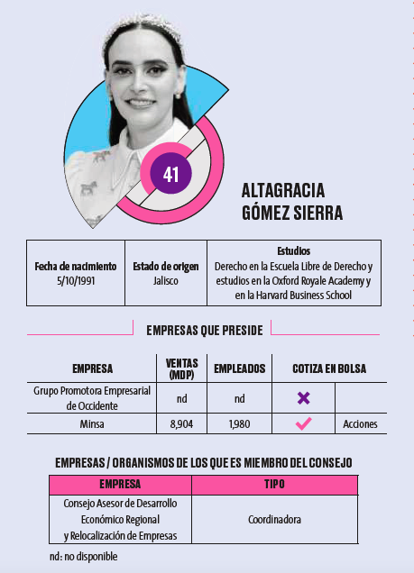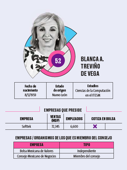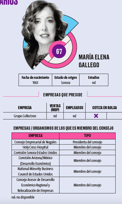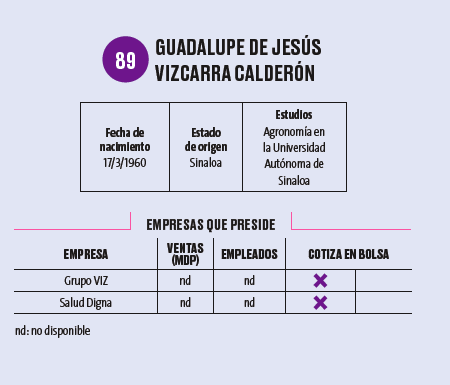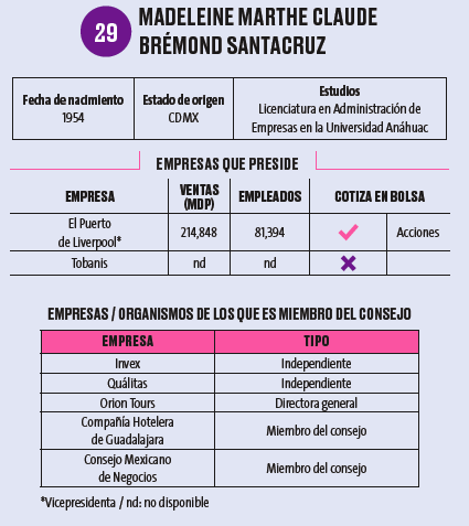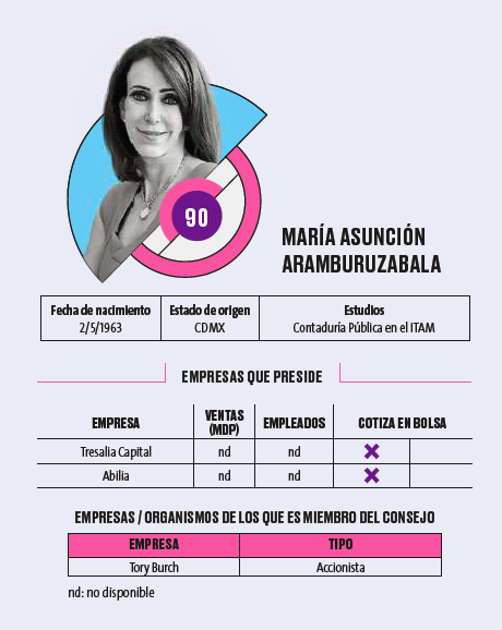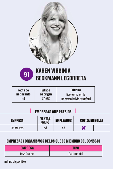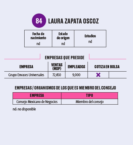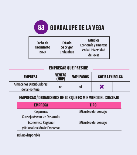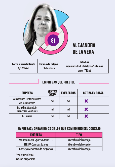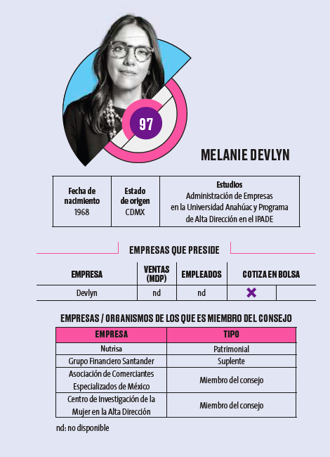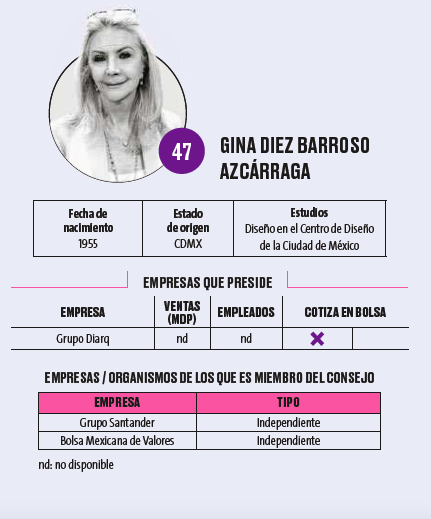 Laura Diez Barroso Azcárraga, Madeleine Marthe Claude Brémond Santacruz y Altagracia Gómez Sierra son las tres primeras mujeres de negocios que destacan en el listado. A continuación te damos la lista completa. 1. Laura Diez Barroso Azcárraga. Ocupa la posición 14 en el Ranking. Nació en la Ciudad de México. Su liderazgo abarca a empresas como Grupo Financiero Santander y Grupo Aeroportuario del Pacífico, consorcios en conjunto dan empleo a casi 30,000 personas. 2. Madeleine Marthe Claude Brémond Santacruz Ocupa la posición 29 en el Ranking. Nació en la capital del país. Su liderazgo influye en compañías como El Puerto de Liverpool y Tobanis. 3. Altagracia Gómez Sierra Lugar 41 en el Ranking. Con estudios en la Oxford Royale Academy y Harvard Business School, esta ejecutiva lidera a Grupo Promotora Empresarial de Occidente y Minsa. 4. Gina Diez Barroso Azcárraga Posición 47 en el Ranking. Originaria de la CDMX, esta empresaria está al frente de Grupo Diarq. 5. Blanca Treviño de Vega Lugar 52 del Ranking. Es originaria del estado de Nuevo León y cuenta con estudios en Ciencias de la Computación. Actualmente está al frente de Softtek. 6. María Elena Gallego Lugar en el Ranking 67. Originaria del estado de Sonora. Gallego lidera a la empresa Grupo Collectron. 7. Alejandra de la Vega Posición en el ranking 81. De la Vega nació en el estado de Chihuahua y cursó la carrera de Ingeniería Industrial y de Sistemas en el Tecnológico de Monterrey. 8. Guadalupe de la Vega Lugar 83 en el Ranking Cuenta con estudios en Economía y Finanzas en la Universidad de Texas. Actualmente preside Almacenes Distribuidores de la Frontera. 9. Laura Zapata Oscoz Posición en el ranking: 84 Zapata Oscoz está al frente de Grupo Envases Universales. 10. Guadalupe de Jesús Vizcarra Calderón Lugar que ocupa en el Ranking: 89. Nació en el estado de Sinaloa y está a cargo del liderazgo en Grupo Viz y Salud Digna. 11. María Asunción Aramburuzabala Ocupa el lugar 90 en el Ranking. Cuenta con estudios de Contaduría Pública en el ITAM. Está al frente de Tresalia Capital y Abilia. 12. Karen Virginia Beckmann Legorreta Lugar que ocupa en el Ranking: 91. Originaria de la CDMX, esta empresaria cuenta con estudios en Economía por la Universidad de Stanford. Está a cargo de PP Marcas. 13. Melanie Devlyn Ocupa la posición 97 en el Ranking. Nació en la CDMX y estudió Administración de Empresas en la Universidad Anáhuac. Lleva el liderazgo en Devlyn. LEE AQUÍ LA EDICIÓN DE LOS EMPRESARIOS DE MÉXICO