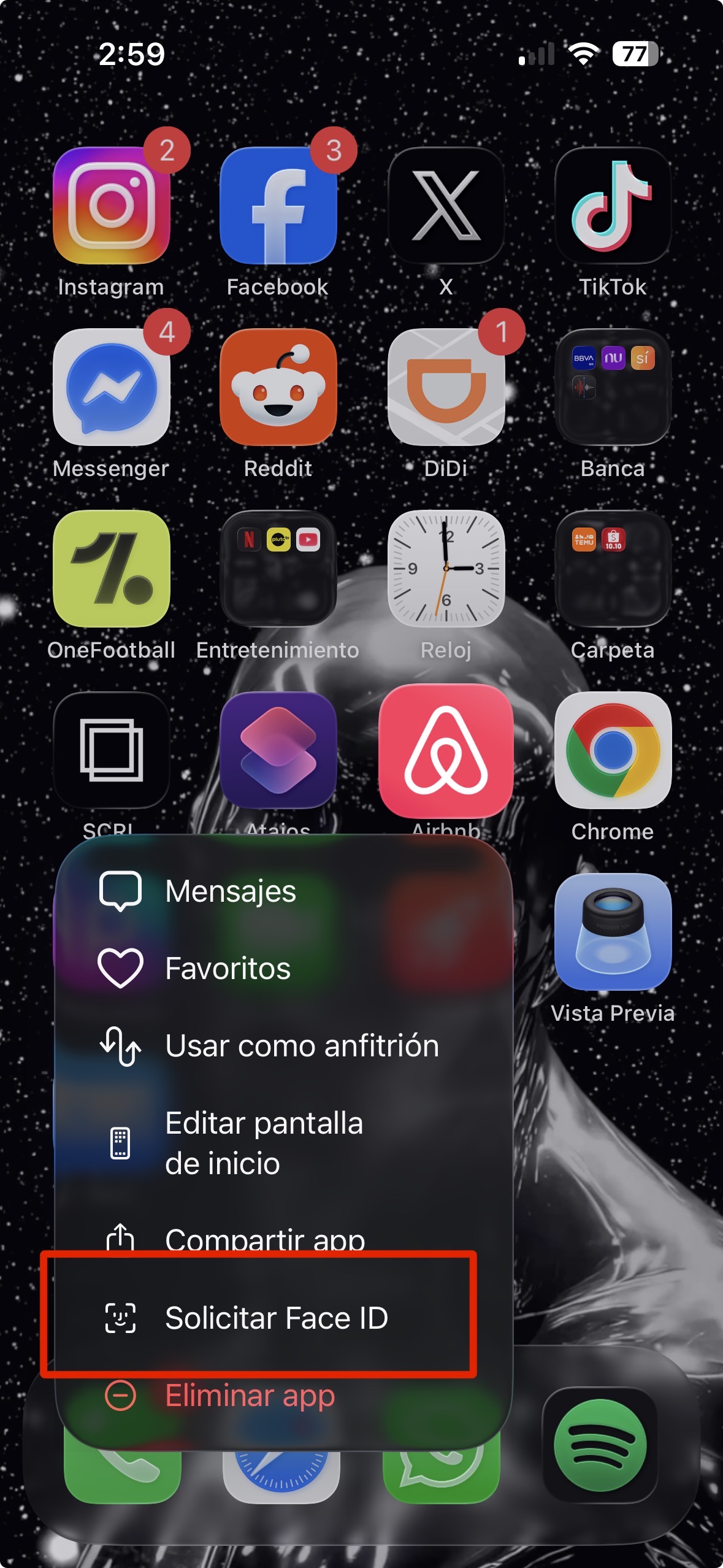 1. Verifica la versión de software Confirma que tu iPhone esté actualizado a iOS 18 o posterior, ya que la función solo está disponible en esta versión o posteriores. 2. Selecciona la app que quieres ocultar Mantén presionado el ícono de la app que deseas proteger hasta que aparezca el menú de opciones. 3. Activa la protección con Face ID o Touch ID Toca la opción “Requerir Face ID” o “Requerir Touch ID”, según el modelo del dispositivo. Algunas apps nativas, como Configuración y Cámara, no incluyen esta función y solo pueden bloquearse, no ocultarse. 4. Confirma la configuración Vuelve a tocar “Requerir Face ID” o selecciona “Ocultar y requerir Face ID” si el sistema lo muestra. Desliza de derecha a izquierda hasta llegar a la Biblioteca de apps y baja hasta el final. En la parte inferior aparecerá la carpeta Ocultas. Tócala y usa tu Face ID o Touch ID para ver y usar las aplicaciones que hayas guardado ahí. CarPlay: permite seguir actividades y responder mensajes sin distraerse durante la conducción. Mapas: recuerda rutas frecuentes, muestra retrasos y da la opción de compartir ubicaciones visitadas. Juegos: nueva aplicación que concentra la actividad en videojuegos y permite retar a amigos. Wallet: actualiza en tiempo real el estado de equipaje y vuelos desde el pase de abordar. Fotos: incorpora pestañas “Biblioteca” y “Colecciones” para organizar mejor las imágenes; además, las fotos favoritas incluyen efecto 3D. Accesibilidad: agrega mejoras para usuarios de Braille y funciones que reducen mareos al desplazarse en vehículos.