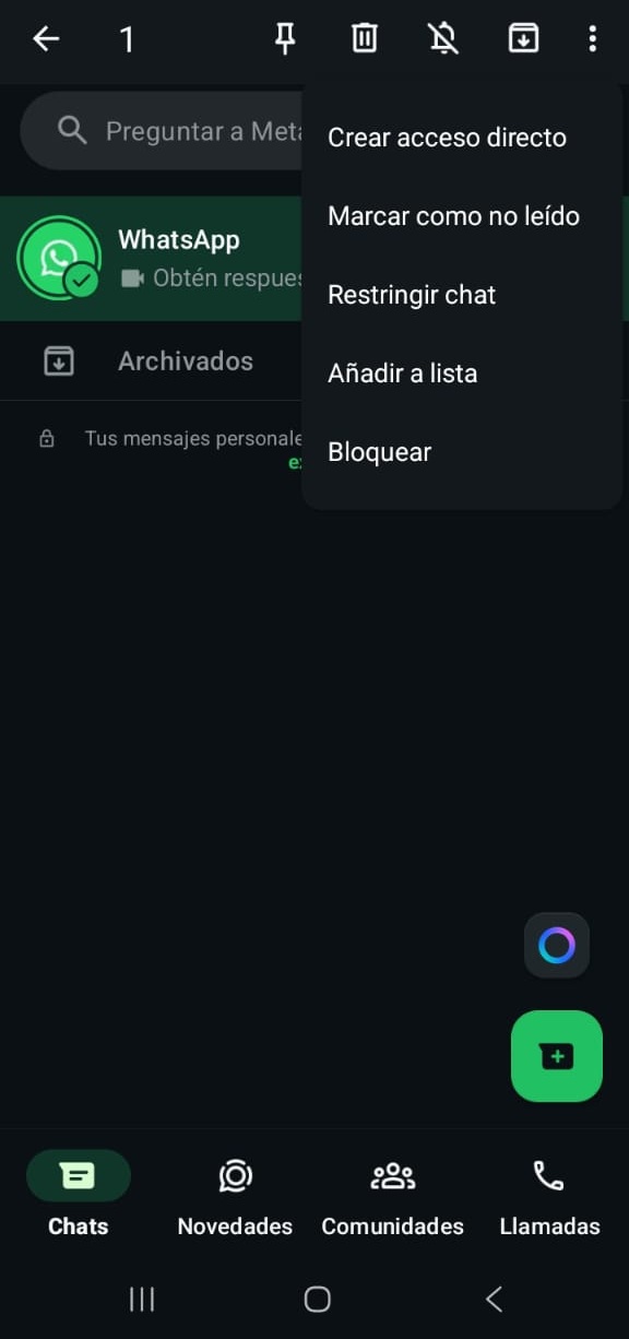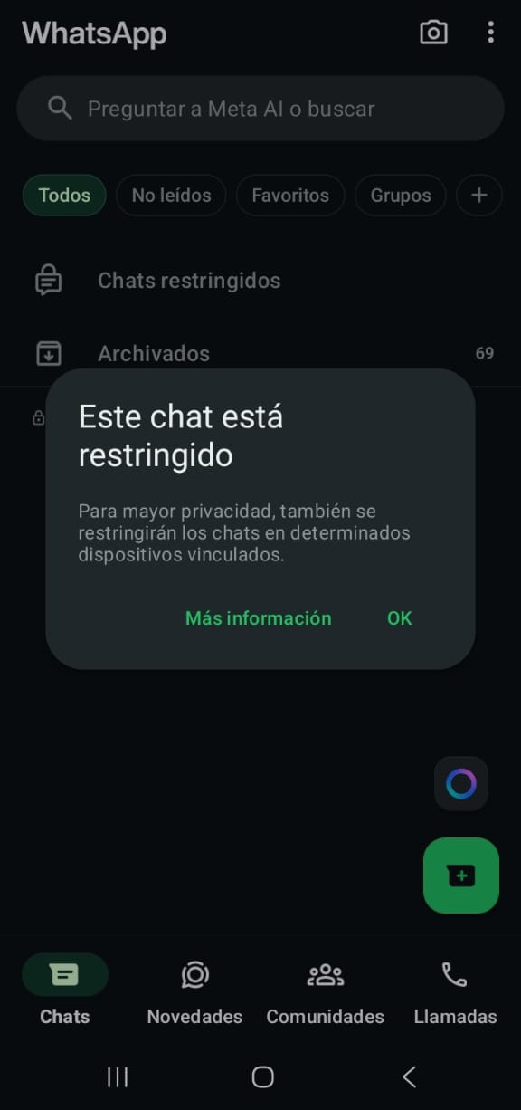¿Tienes un chat confidencial? Restringe su acceso con códigos En casos en que una conversación necesite una barrera adicional de seguridad, existe la función de restringir chats para permitir su acceso con una contraseña, ya sea un patrón, PIN, contraseña o datos biométricos. 1. Abre tu aplicación y selecciona el chat que quieras hacer confidencial. 2. Selecciona los tres puntos del menú que aparezca y busca la opción ‘Restringir chat’. 3. Presiona en Continuar, y confirma la acción con el método de bloqueo que compartes en tu teléfono móvil. 4. En tu pantalla principal de WhatsApp aparecerá una sección de Chats restringidos, y podrás acceder solamente con la contraseña o forma de bloqueo que tengas. También es posible ocultar la sección de tu pantalla principal, al activar el Código Secreto.