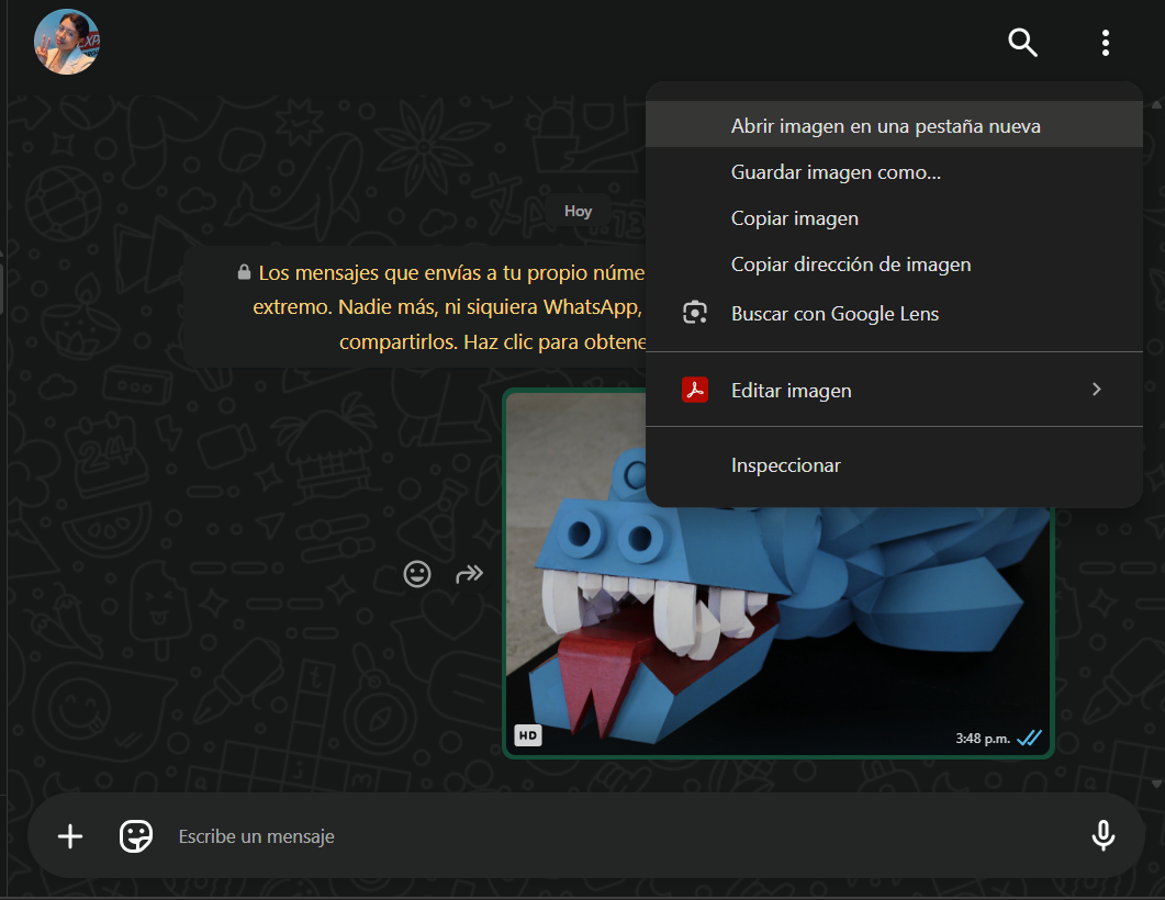 Revisa fotografías en una nueva pestaña Siguiendo la línea de personas que trabajan utilizando imágenes, y necesitan revisar el contenido antes de pasar a siguientes fases, puede servir ver la imagen aparte sin descargar el archivo. Esta función está orientada para WhatsApp Web. 1. Abre el chat donde tienes la fotografía. Da clic derecho sobre la imagen. 2. Selecciona la opción “Abrir la imagen en una pestaña nueva”. 3. Tendrás la imagen en una nueva página para que la revises con detenimiento.
