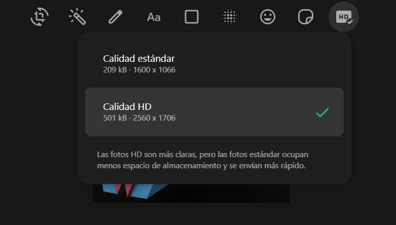 No más fotos borrosas, envíalas en HD Bien se sabe que al mandar fotografías y videos a través de WhatsApp se reduce su resolución. Esto sucede por la compresión automática que acorta el tamaño del archivo para su envío. La aplicación sacrifica la nitidez y detalle por la velocidad de enviar el documento. Para las personas que utilizan fotografías o imágenes en su trabajo, y requieren enviarlas con rapidez, esto puede ser contraproducente. Sin embargo, ahora existe la función de enviar los archivos de fotos o video en definición HD de manera sencilla. 1. Busca el video o fotografía que vas a enviar y selecciónalo. 2. Una vez seleccionada, WhatsApp señalará distintas funciones para editar. Busca el recuadro “HD – Calidad de la foto”. 3. Cambia la opción de ‘estándar’ a ‘HD’. La aplicación señalará la diferencia de peso y resolución de ambas formas. 4. Envía el archivo.