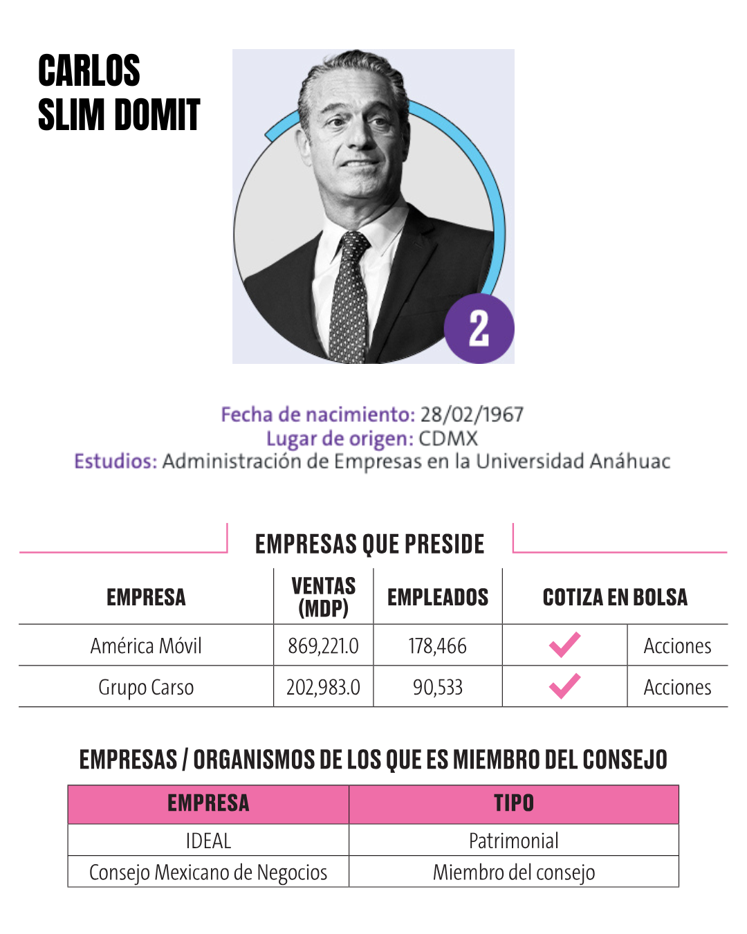 2.- Carlos Slim Domit Carlos Slim Domit, de 58 años, nació el 28 de febrero de 1967 en la Ciudad de México. Es uno de los principales herederos del conglomerado construido por su padre. Estudió Administración de Empresas en la Universidad Anáhuac y encabeza algunas de las compañías más importantes del país. Preside el Consejo de Administración de dos firmas clave del ecosistema empresarial familiar: Slim Domit ha consolidado su papel en la continuidad y modernización del imperio empresarial de la familia, con un enfoque en innovación, expansión tecnológica y sostenibilidad.