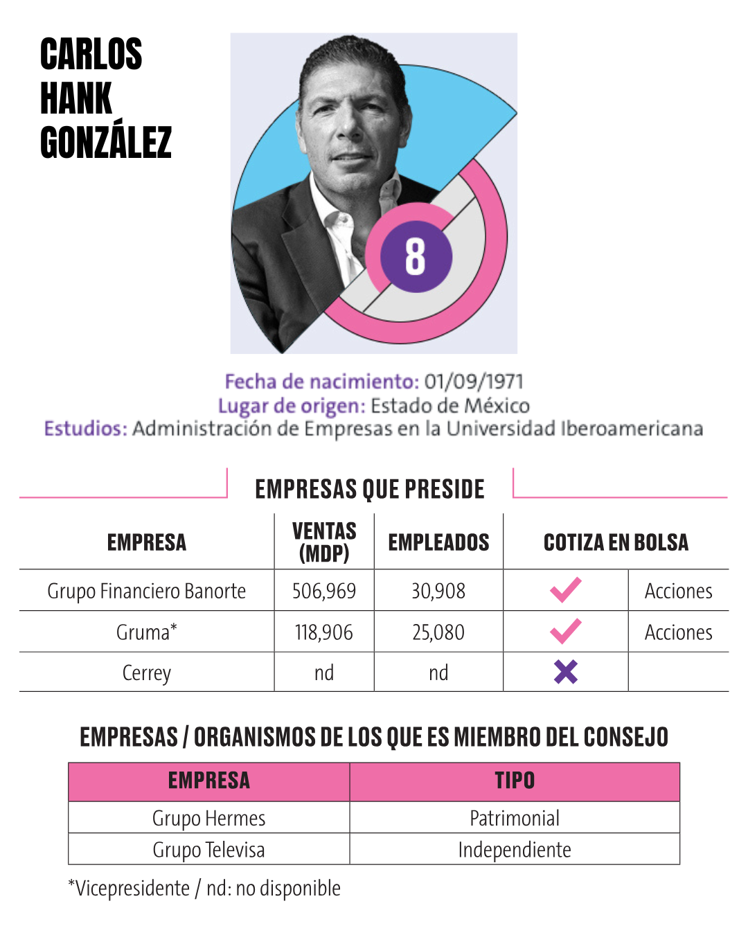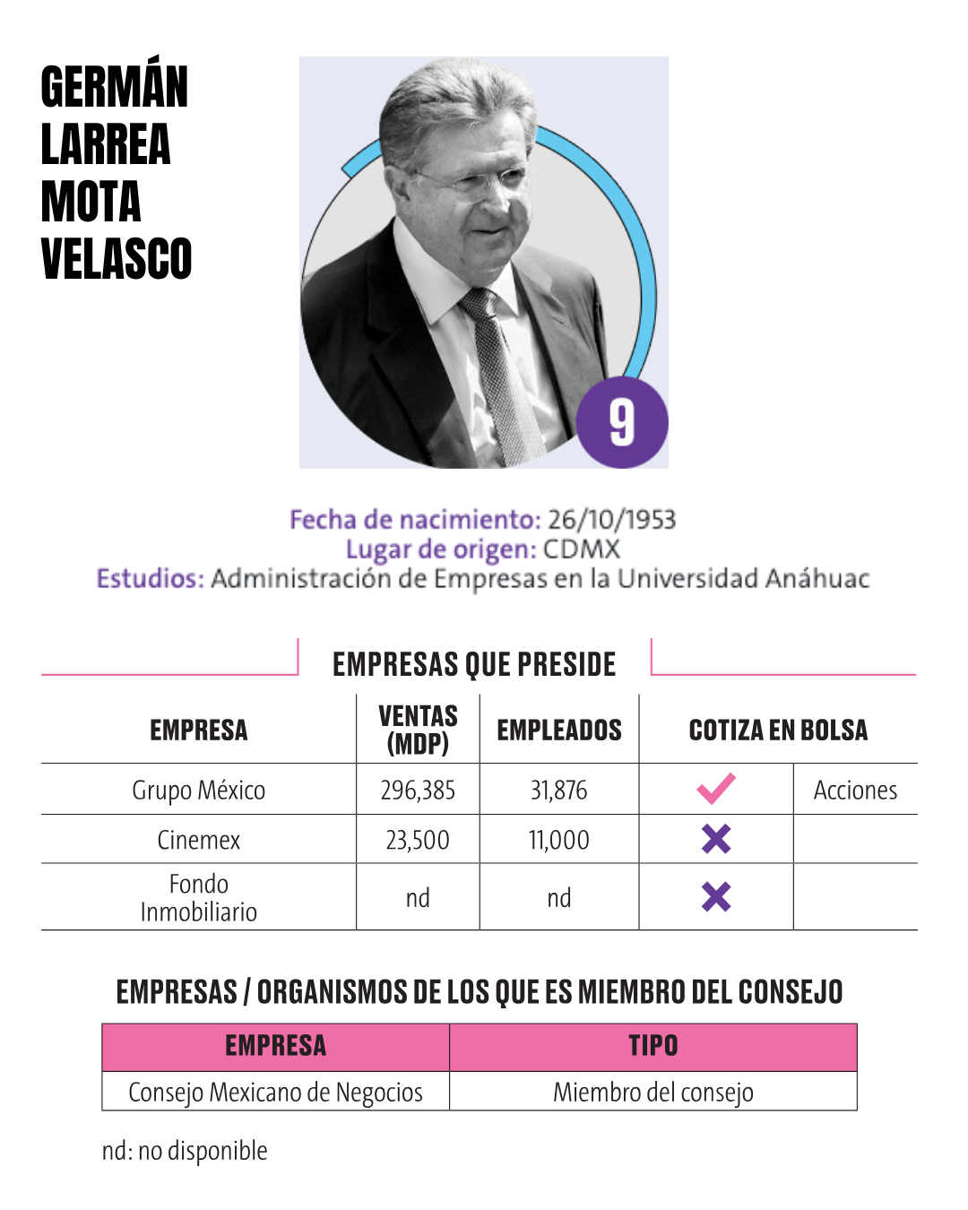 8.- Carlos Hank González Carlos Hank González, de 54 años y originario del Estado de México, es un empresario destacado en los sectores financiero y alimenticio. Estudió Administración de Empresas en la Universidad Iberoamericana y ha consolidado su papel como líder en importantes corporativos nacionales. Preside algunas de las empresas más relevantes del país, combinando cargos directivos y vicepresidencias estratégicas: Con una trayectoria sólida, Hank González combina liderazgo estratégico con visión empresarial, consolidándose como un referente en la banca, la alimentación y otros sectores clave de la economía mexicana. Germán Larrea Mota Velasco, de 71 años y originario de la Ciudad de México, es uno de los empresarios más influyentes del país en los sectores minero y de entretenimiento. Estudió Administración de Empresas en la Universidad Anáhuac y ha consolidado un amplio portafolio empresarial en México y el extranjero. Recientemente lanzó una oferta para comprar Banamex, la cual fue rechazada posteriormente por Citi, dueño del negocio. Preside compañías clave en la economía mexicana: Larrea Mota Velasco se ha destacado por su liderazgo en la industria minera, combinando visión estratégica y gestión empresarial, consolidándose como un referente del sector y de la economía nacional.