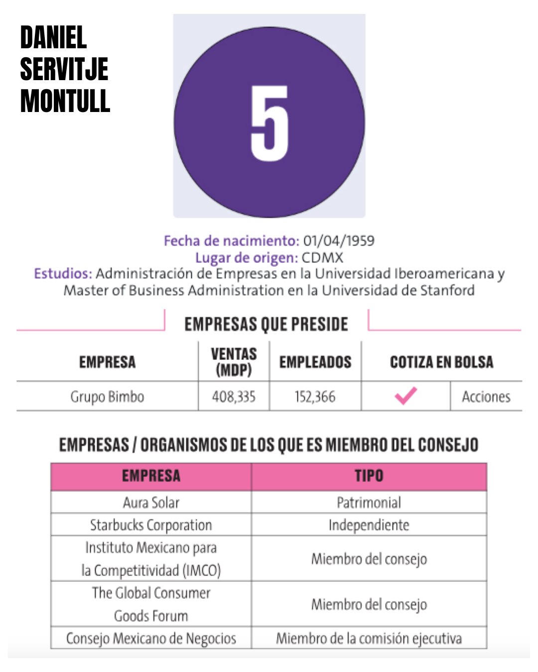 5.- Daniel Servitje Montull Daniel Servitje Montull, de 66 años y originario de la Ciudad de México, es uno de los empresarios más destacados del país en el sector de alimentos. Estudió Administración de Empresas en la Universidad Iberoamericana y obtuvo un MBA en la Universidad de Stanford, consolidando su formación en gestión y liderazgo empresarial. Servitje preside Grupo Bimbo, la mayor empresa de panificación del mundo, con presencia en múltiples países y un extenso portafolio de marcas reconocidas: Servitje se ha consolidado como un referente de innovación, expansión internacional y sostenibilidad dentro de la industria alimentaria mexicana y global.