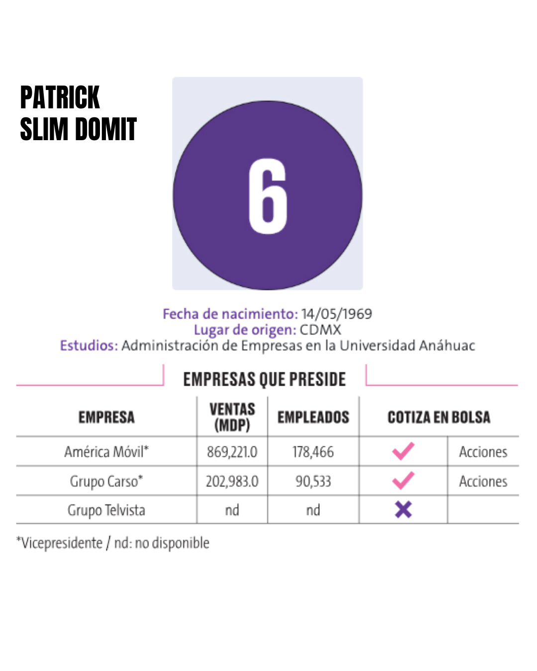 6.- Patrick Slim Domit Patrick Slim Domit, de 56 años y originario de la Ciudad de México, estudió Administración de Empresas en la Universidad Anáhuac y pertenece a la segunda generación al frente del conglomerado Slim. Actualmente ocupa cargos de vicepresidente en dos de las principales empresas del grupo: El empresario se centra en gestión estratégica y supervisión corporativa, apoyando la expansión y consolidación de las compañías familiares y asegurando la continuidad del legado empresarial.