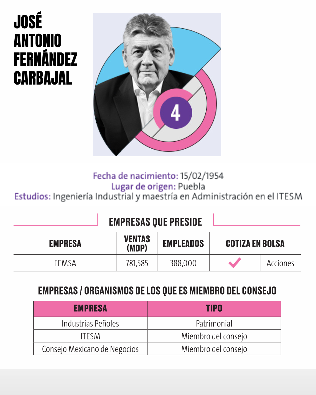 4.- José Antonio Fernández Carbajal José Antonio Fernández Carbajal, de 71 años y originario de Puebla, es uno de los empresarios más reconocidos de México. Ingeniero industrial con maestría en administración por el ITESM, ha liderado el crecimiento de empresas clave en el país, especialmente en bebidas, comercio y servicios. Preside FEMSA, uno de los conglomerados más grandes de México, con operaciones en comercio minorista, bebidas y logística: Fernández Carbajal se mantiene como un referente clave en la economía mexicana, reconocido por su liderazgo y su capacidad para dirigir conglomerados estratégicos en sectores vitales del país.