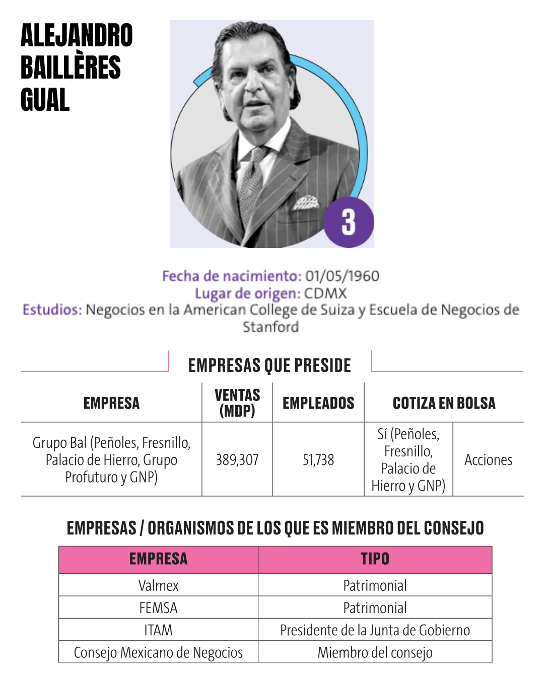 3.- Alejandro Bailléres Gual Alejandro Bailléres Gual, de 65 años y originario de la Ciudad de México, es uno de los empresarios más influyentes del país. Estudió negocios en el American College de Suiza y completó su formación en la Escuela de Negocios de Stanford. Preside algunas de las empresas más importantes de México, especialmente en minería, comercio y servicios financieros: Con este perfil, Bailléres Gual se mantiene como uno de los líderes más influyentes de México, combinando gestión empresarial, visión estratégica y participación en la formación de políticas y organismos clave del país.