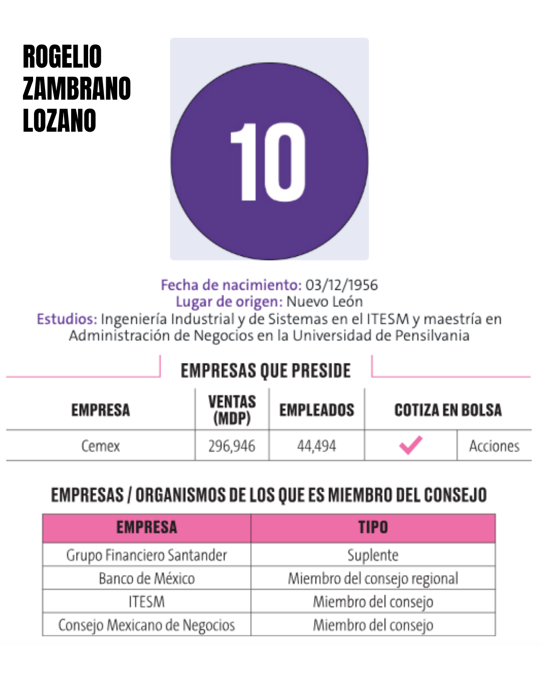 10.- Rogelio Zambrano Lozano Rogelio Zambrano Lozano, de 68 años y originario de Nuevo León, es un referente en la industria de la construcción y materiales, con una trayectoria destacada en el ámbito empresarial mexicano. Es Ingeniero Industrial y de Sistemas por el ITESM y cuenta con una Maestría en Administración de Negocios por la Universidad de Pensilvania. Preside la empresa más relevante de su portafolio: Zambrano Lozano ha consolidado a Cemex como un actor clave en la construcción nacional e internacional, combinando innovación y expansión estratégica en un sector fundamental para la economía.