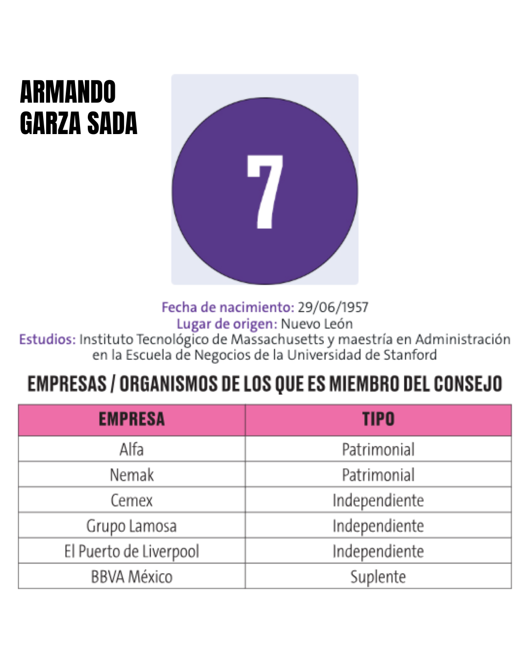 7.- Armando Garza Sada Armando Garza Sada, de 68 años y originario de Nuevo León, es un empresario destacado en los sectores industrial y financiero. Estudió en el Instituto Tecnológico de Massachusetts y completó una maestría en Administración en la Escuela de Negocios de la Universidad de Stanford, lo que lo ha posicionado como un líder global en la industria mexicana. Garza Sada participa en diversos grupos empresariales, tanto como accionista patrimonial como en roles independientes en corporativos clave: Garza Sada es reconocido por su liderazgo estratégico y su influencia en manufactura, construcción y servicios financieros, contribuyendo al crecimiento y consolidación de empresas emblemáticas en México y en el extranjero.